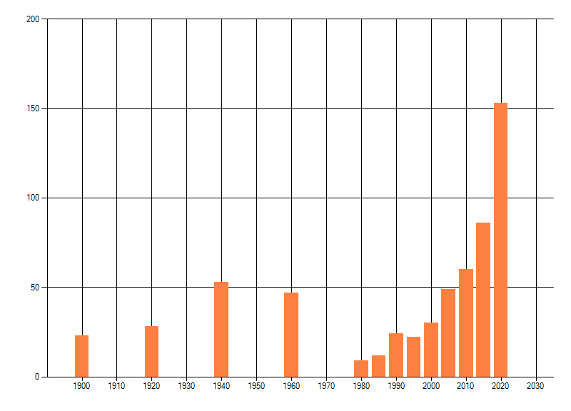 Het aantal atlasblokken (5x5 km) waarin de soort is gemeld binnen een periode van vijf jaar (vanaf 1980) of twintig jaar. Niet gecorrigeerd voor waarnemersinspanning en het aantal doorgegeven waarnemingen kan sterk variëren per periode, dus een trend in verspreiding kan hier niet direct uit worden afgelezen. Het opgegeven jaartal is het eerste jaar van de periode. Bron: gevalideerde waarnemingen uit de NDFF.