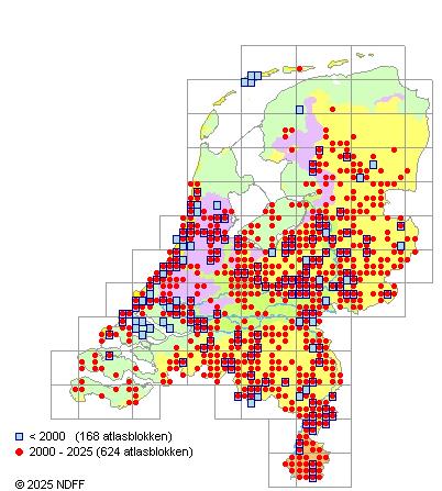 Het aantal atlasblokken (5x5 km) waarin de soort is gemeld binnen een periode van vijf jaar (vanaf 1980) of twintig jaar. Niet gecorrigeerd voor waarnemersinspanning en het aantal doorgegeven waarnemingen kan sterk variëren per periode, dus een trend in verspreiding kan hier niet direct uit worden afgelezen. Het opgegeven jaartal is het eerste jaar van de periode. Bron: gevalideerde waarnemingen uit de NDFF.