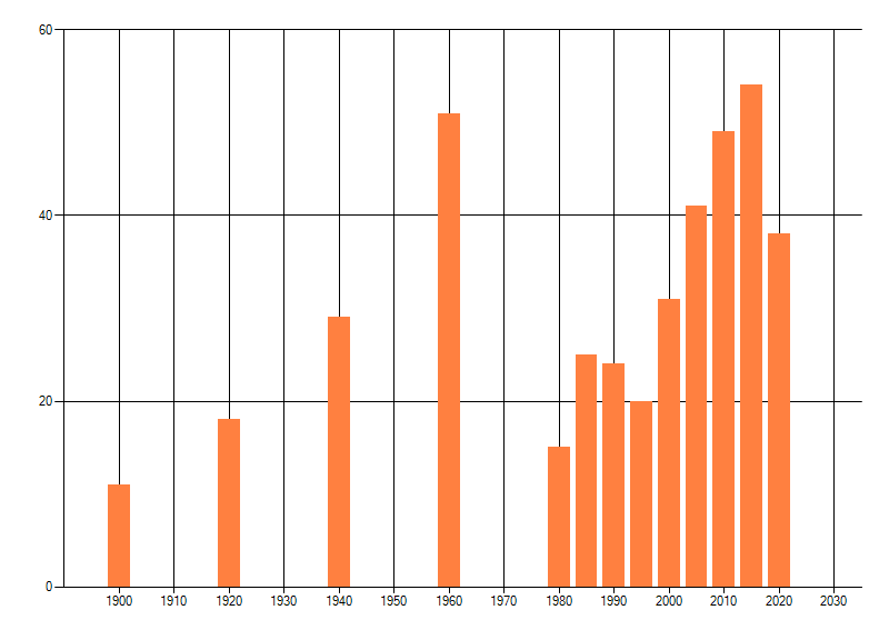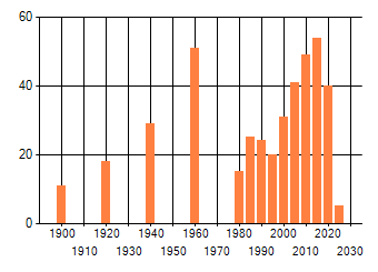 Het aantal atlasblokken (5x5 km) waarin de soort is gemeld binnen een periode van vijf jaar (vanaf 1980) of twintig jaar. Niet gecorrigeerd voor waarnemersinspanning en het aantal doorgegeven waarnemingen kan sterk variëren per periode, dus een trend in verspreiding kan hier niet direct uit worden afgelezen. Het opgegeven jaartal is het eerste jaar van de periode. Bron: gevalideerde waarnemingen uit de NDFF.