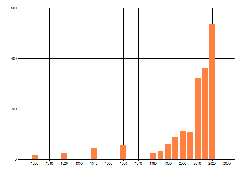 Het aantal atlasblokken (5x5 km) waarin de soort is gemeld binnen een periode van vijf jaar (vanaf 1980) of twintig jaar. Niet gecorrigeerd voor waarnemersinspanning en het aantal doorgegeven waarnemingen kan sterk variëren per periode, dus een trend in verspreiding kan hier niet direct uit worden afgelezen. Het opgegeven jaartal is het eerste jaar van de periode. Bron: gevalideerde waarnemingen uit de NDFF.