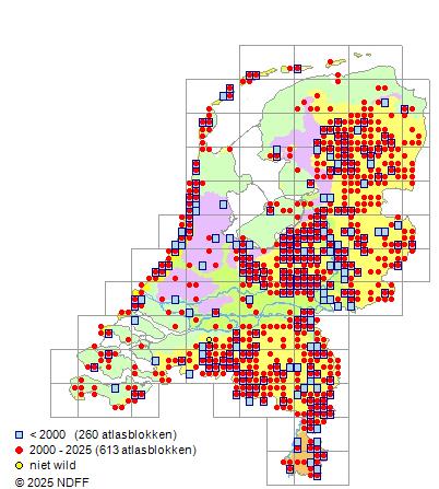 Algemeen. Komt vooral voor in de duinen en op de zandgronden in het binnenland; elders af en toe een waarneming. RL: kwetsbaar.