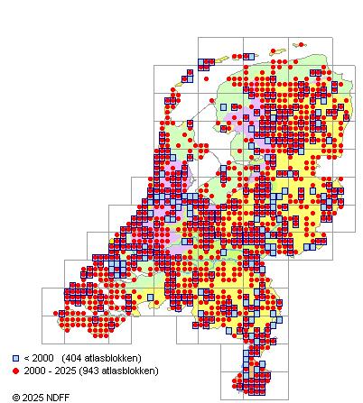 Het aantal atlasblokken (5x5 km) waarin de soort is gemeld binnen een periode van vijf jaar (vanaf 1980) of twintig jaar. Niet gecorrigeerd voor waarnemersinspanning en het aantal doorgegeven waarnemingen kan sterk variëren per periode, dus een trend in verspreiding kan hier niet direct uit worden afgelezen. Het opgegeven jaartal is het eerste jaar van de periode. Bron: gevalideerde waarnemingen uit de NDFF.