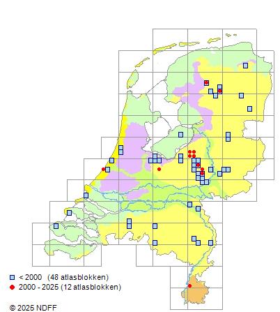 Het aantal atlasblokken (5x5 km) waarin de soort is gemeld binnen een periode van vijf jaar (vanaf 1980) of twintig jaar. Niet gecorrigeerd voor waarnemersinspanning en het aantal doorgegeven waarnemingen kan sterk variëren per periode, dus een trend in verspreiding kan hier niet direct uit worden afgelezen. Het opgegeven jaartal is het eerste jaar van de periode. Bron: gevalideerde waarnemingen uit de NDFF.