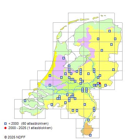 Het aantal atlasblokken (5x5 km) waarin de soort is gemeld binnen een periode van vijf jaar (vanaf 1980) of twintig jaar. Niet gecorrigeerd voor waarnemersinspanning en het aantal doorgegeven waarnemingen kan sterk variëren per periode, dus een trend in verspreiding kan hier niet direct uit worden afgelezen. Het opgegeven jaartal is het eerste jaar van de periode. Bron: gevalideerde waarnemingen uit de NDFF.