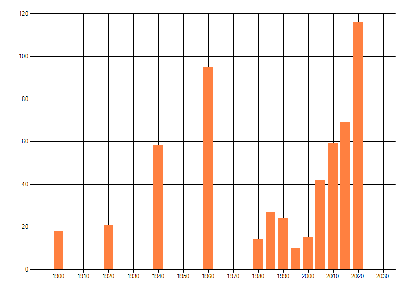 Het aantal atlasblokken (5x5 km) waarin de soort is gemeld binnen een periode van vijf jaar (vanaf 1980) of twintig jaar. Niet gecorrigeerd voor waarnemersinspanning en het aantal doorgegeven waarnemingen kan sterk variëren per periode, dus een trend in verspreiding kan hier niet direct uit worden afgelezen. Het opgegeven jaartal is het eerste jaar van de periode. Bron: gevalideerde waarnemingen uit de NDFF.