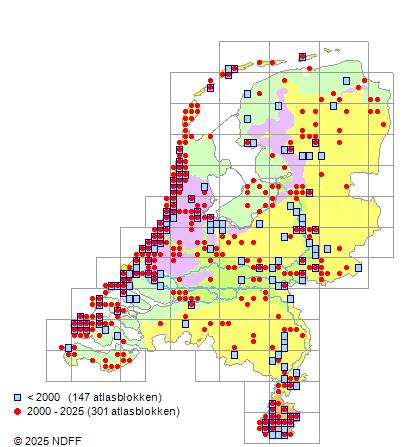 Het aantal atlasblokken (5x5 km) waarin de soort is gemeld binnen een periode van vijf jaar (vanaf 1980) of twintig jaar. Niet gecorrigeerd voor waarnemersinspanning en het aantal doorgegeven waarnemingen kan sterk variëren per periode, dus een trend in verspreiding kan hier niet direct uit worden afgelezen. Het opgegeven jaartal is het eerste jaar van de periode. Bron: gevalideerde waarnemingen uit de NDFF.