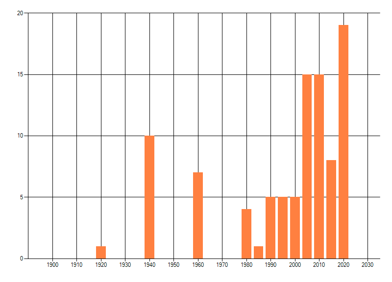 Het aantal atlasblokken (5x5 km) waarin de soort is gemeld binnen een periode van vijf jaar (vanaf 1980) of twintig jaar. Niet gecorrigeerd voor waarnemersinspanning en het aantal doorgegeven waarnemingen kan sterk variëren per periode, dus een trend in verspreiding kan hier niet direct uit worden afgelezen. Het opgegeven jaartal is het eerste jaar van de periode. Bron: gevalideerde waarnemingen uit de NDFF.