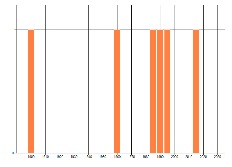 Het aantal atlasblokken (5x5 km) waarin de soort is gemeld binnen een periode van vijf jaar (vanaf 1980) of twintig jaar. Niet gecorrigeerd voor waarnemersinspanning en het aantal doorgegeven waarnemingen kan sterk variëren per periode, dus een trend in verspreiding kan hier niet direct uit worden afgelezen. Het opgegeven jaartal is het eerste jaar van de periode. Bron: gevalideerde waarnemingen uit de NDFF.