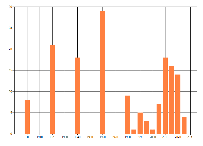 Het aantal atlasblokken (5x5 km) waarin de soort is gemeld binnen een periode van vijf jaar (vanaf 1980) of twintig jaar. Niet gecorrigeerd voor waarnemersinspanning en het aantal doorgegeven waarnemingen kan sterk variëren per periode, dus een trend in verspreiding kan hier niet direct uit worden afgelezen. Het opgegeven jaartal is het eerste jaar van de periode. Bron: gevalideerde waarnemingen uit de NDFF.