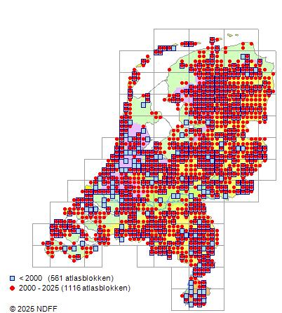 Het aantal atlasblokken (5x5 km) waarin de soort is gemeld binnen een periode van vijf jaar (vanaf 1980) of twintig jaar. Niet gecorrigeerd voor waarnemersinspanning en het aantal doorgegeven waarnemingen kan sterk variëren per periode, dus een trend in verspreiding kan hier niet direct uit worden afgelezen. Het opgegeven jaartal is het eerste jaar van de periode. Bron: gevalideerde waarnemingen uit de NDFF.
