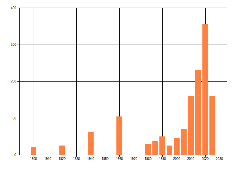 Het aantal atlasblokken (5x5 km) waarin de soort is gemeld binnen een periode van vijf jaar (vanaf 1980) of twintig jaar. Niet gecorrigeerd voor waarnemersinspanning en het aantal doorgegeven waarnemingen kan sterk variëren per periode, dus een trend in verspreiding kan hier niet direct uit worden afgelezen. Het opgegeven jaartal is het eerste jaar van de periode. Bron: gevalideerde waarnemingen uit de NDFF.