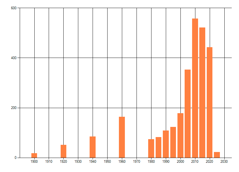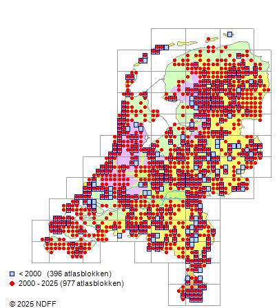 Het aantal atlasblokken (5x5 km) waarin de soort is gemeld binnen een periode van vijf jaar (vanaf 1980) of twintig jaar. Niet gecorrigeerd voor waarnemersinspanning en het aantal doorgegeven waarnemingen kan sterk variëren per periode, dus een trend in verspreiding kan hier niet direct uit worden afgelezen. Het opgegeven jaartal is het eerste jaar van de periode. Bron: gevalideerde waarnemingen uit de NDFF.