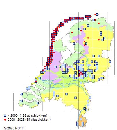 Het aantal atlasblokken (5x5 km) waarin de soort is gemeld binnen een periode van vijf jaar (vanaf 1980) of twintig jaar. Niet gecorrigeerd voor waarnemersinspanning en het aantal doorgegeven waarnemingen kan sterk variëren per periode, dus een trend in verspreiding kan hier niet direct uit worden afgelezen. Het opgegeven jaartal is het eerste jaar van de periode. Bron: gevalideerde waarnemingen uit de NDFF.