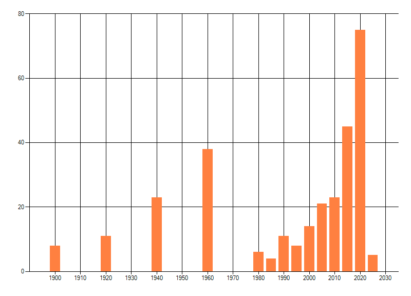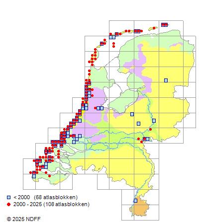 Het aantal atlasblokken (5x5 km) waarin de soort is gemeld binnen een periode van vijf jaar (vanaf 1980) of twintig jaar. Niet gecorrigeerd voor waarnemersinspanning en het aantal doorgegeven waarnemingen kan sterk variëren per periode, dus een trend in verspreiding kan hier niet direct uit worden afgelezen. Het opgegeven jaartal is het eerste jaar van de periode. Bron: gevalideerde waarnemingen uit de NDFF.