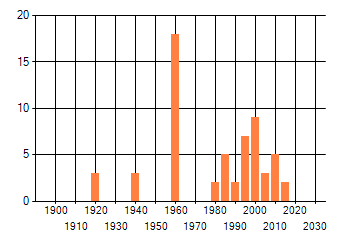 Het aantal atlasblokken (5x5 km) waarin de soort is gemeld binnen een periode van vijf jaar (vanaf 1980) of twintig jaar. Niet gecorrigeerd voor waarnemersinspanning en het aantal doorgegeven waarnemingen kan sterk variëren per periode, dus een trend in verspreiding kan hier niet direct uit worden afgelezen. Het opgegeven jaartal is het eerste jaar van de periode. Bron: gevalideerde waarnemingen uit de NDFF.
