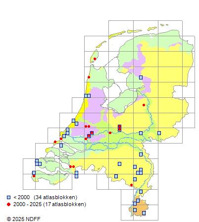 Zeldzaam. Komt lokaal voor in de zuidelijke helft van het land. RL: ernstig bedreigd.