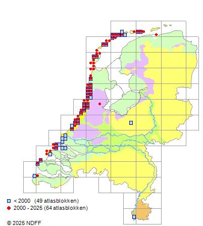 Het aantal atlasblokken (5x5 km) waarin de soort is gemeld binnen een periode van vijf jaar (vanaf 1980) of twintig jaar. Niet gecorrigeerd voor waarnemersinspanning en het aantal doorgegeven waarnemingen kan sterk variëren per periode, dus een trend in verspreiding kan hier niet direct uit worden afgelezen. Het opgegeven jaartal is het eerste jaar van de periode. Bron: gevalideerde waarnemingen uit de NDFF.