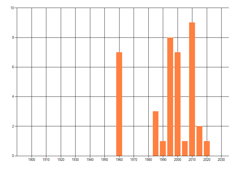 Het aantal atlasblokken (5x5 km) waarin de soort is gemeld binnen een periode van vijf jaar (vanaf 1980) of twintig jaar. Niet gecorrigeerd voor waarnemersinspanning en het aantal doorgegeven waarnemingen kan sterk variëren per periode, dus een trend in verspreiding kan hier niet direct uit worden afgelezen. Het opgegeven jaartal is het eerste jaar van de periode. Bron: gevalideerde waarnemingen uit de NDFF.
