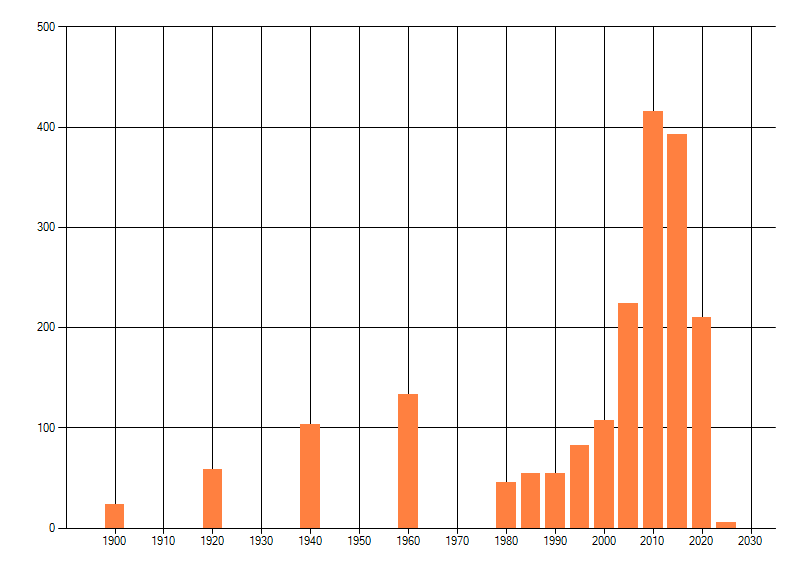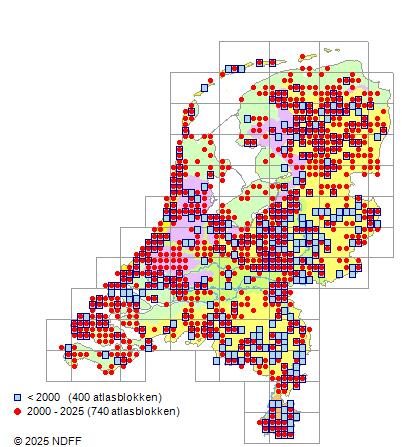 Het aantal atlasblokken (5x5 km) waarin de soort is gemeld binnen een periode van vijf jaar (vanaf 1980) of twintig jaar. Niet gecorrigeerd voor waarnemersinspanning en het aantal doorgegeven waarnemingen kan sterk variëren per periode, dus een trend in verspreiding kan hier niet direct uit worden afgelezen. Het opgegeven jaartal is het eerste jaar van de periode. Bron: gevalideerde waarnemingen uit de NDFF.