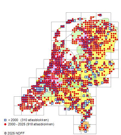 Het aantal atlasblokken (5x5 km) waarin de soort is gemeld binnen een periode van vijf jaar (vanaf 1980) of twintig jaar. Niet gecorrigeerd voor waarnemersinspanning en het aantal doorgegeven waarnemingen kan sterk variëren per periode, dus een trend in verspreiding kan hier niet direct uit worden afgelezen. Het opgegeven jaartal is het eerste jaar van de periode. Bron: gevalideerde waarnemingen uit de NDFF.