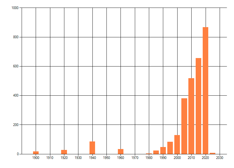 Het aantal atlasblokken (5x5 km) waarin de soort is gemeld binnen een periode van vijf jaar (vanaf 1980) of twintig jaar. Niet gecorrigeerd voor waarnemersinspanning en het aantal doorgegeven waarnemingen kan sterk variëren per periode, dus een trend in verspreiding kan hier niet direct uit worden afgelezen. Het opgegeven jaartal is het eerste jaar van de periode. Bron: gevalideerde waarnemingen uit de NDFF.
