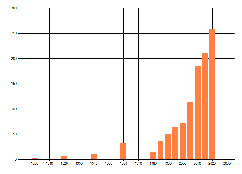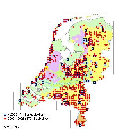 Het aantal atlasblokken (5x5 km) waarin de soort is gemeld binnen een periode van vijf jaar (vanaf 1980) of twintig jaar. Niet gecorrigeerd voor waarnemersinspanning en het aantal doorgegeven waarnemingen kan sterk variëren per periode, dus een trend in verspreiding kan hier niet direct uit worden afgelezen. Het opgegeven jaartal is het eerste jaar van de periode. Bron: gevalideerde waarnemingen uit de NDFF.