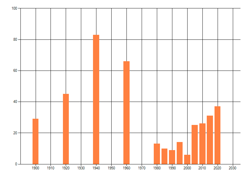 Het aantal atlasblokken (5x5 km) waarin de soort is gemeld binnen een periode van vijf jaar (vanaf 1980) of twintig jaar. Niet gecorrigeerd voor waarnemersinspanning en het aantal doorgegeven waarnemingen kan sterk variëren per periode, dus een trend in verspreiding kan hier niet direct uit worden afgelezen. Het opgegeven jaartal is het eerste jaar van de periode. Bron: gevalideerde waarnemingen uit de NDFF.