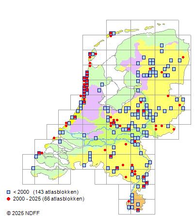 Het aantal atlasblokken (5x5 km) waarin de soort is gemeld binnen een periode van vijf jaar (vanaf 1980) of twintig jaar. Niet gecorrigeerd voor waarnemersinspanning en het aantal doorgegeven waarnemingen kan sterk variëren per periode, dus een trend in verspreiding kan hier niet direct uit worden afgelezen. Het opgegeven jaartal is het eerste jaar van de periode. Bron: gevalideerde waarnemingen uit de NDFF.