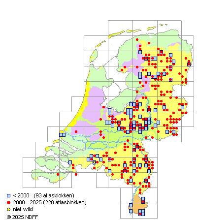 Het aantal atlasblokken (5x5 km) waarin de soort is gemeld binnen een periode van vijf jaar (vanaf 1980) of twintig jaar. Niet gecorrigeerd voor waarnemersinspanning en het aantal doorgegeven waarnemingen kan sterk variëren per periode, dus een trend in verspreiding kan hier niet direct uit worden afgelezen. Het opgegeven jaartal is het eerste jaar van de periode. Bron: gevalideerde waarnemingen uit de NDFF.