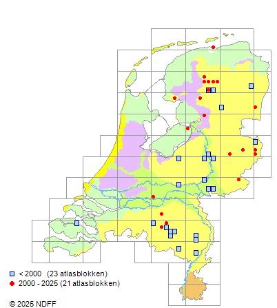 Zeer zeldzaam. Komt lokaal en zeer verspreid over het land voor, vooral in de oostelijke helft van het land. RL: ernstig bedreigd.