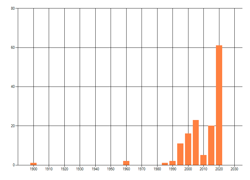 Het aantal atlasblokken (5x5 km) waarin de soort is gemeld binnen een periode van vijf jaar (vanaf 1980) of twintig jaar. Niet gecorrigeerd voor waarnemersinspanning en het aantal doorgegeven waarnemingen kan sterk variëren per periode, dus een trend in verspreiding kan hier niet direct uit worden afgelezen. Het opgegeven jaartal is het eerste jaar van de periode. Bron: gevalideerde waarnemingen uit de NDFF.