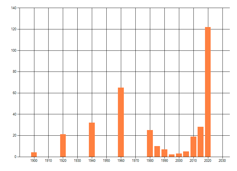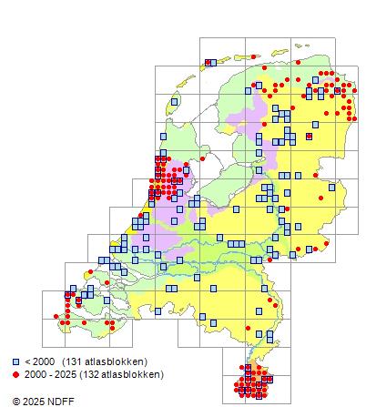 Het aantal atlasblokken (5x5 km) waarin de soort is gemeld binnen een periode van vijf jaar (vanaf 1980) of twintig jaar. Niet gecorrigeerd voor waarnemersinspanning en het aantal doorgegeven waarnemingen kan sterk variëren per periode, dus een trend in verspreiding kan hier niet direct uit worden afgelezen. Het opgegeven jaartal is het eerste jaar van de periode. Bron: gevalideerde waarnemingen uit de NDFF.