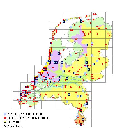 Het aantal atlasblokken (5x5 km) waarin de soort is gemeld binnen een periode van vijf jaar (vanaf 1980) of twintig jaar. Niet gecorrigeerd voor waarnemersinspanning en het aantal doorgegeven waarnemingen kan sterk variëren per periode, dus een trend in verspreiding kan hier niet direct uit worden afgelezen. Het opgegeven jaartal is het eerste jaar van de periode. Bron: gevalideerde waarnemingen uit de NDFF.