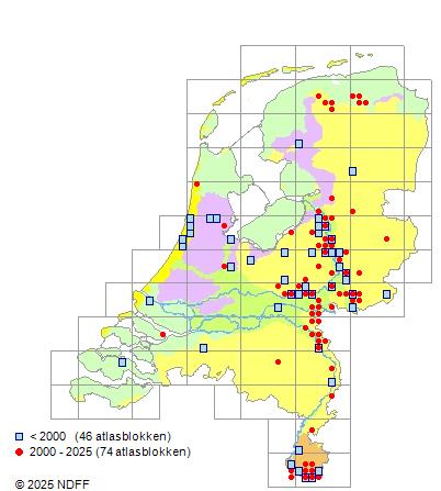 Het aantal atlasblokken (5x5 km) waarin de soort is gemeld binnen een periode van vijf jaar (vanaf 1980) of twintig jaar. Niet gecorrigeerd voor waarnemersinspanning en het aantal doorgegeven waarnemingen kan sterk variëren per periode, dus een trend in verspreiding kan hier niet direct uit worden afgelezen. Het opgegeven jaartal is het eerste jaar van de periode. Bron: gevalideerde waarnemingen uit de NDFF.