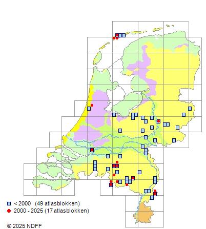 Zeldzaam. Een soort met zeer verspreid over het land slechts een aantal waarnemingen, vooral in het zuidoosten van het land en op Terschelling. RL: ernstig bedreigd.