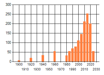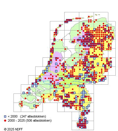 Het aantal atlasblokken (5x5 km) waarin de soort is gemeld binnen een periode van vijf jaar (vanaf 1980) of twintig jaar. Niet gecorrigeerd voor waarnemersinspanning en het aantal doorgegeven waarnemingen kan sterk variëren per periode, dus een trend in verspreiding kan hier niet direct uit worden afgelezen. Het opgegeven jaartal is het eerste jaar van de periode. Bron: gevalideerde waarnemingen uit de NDFF.