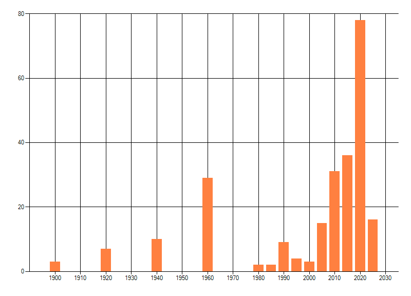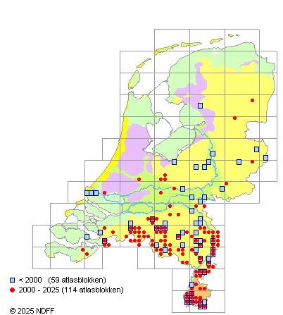 Het aantal atlasblokken (5x5 km) waarin de soort is gemeld binnen een periode van vijf jaar (vanaf 1980) of twintig jaar. Niet gecorrigeerd voor waarnemersinspanning en het aantal doorgegeven waarnemingen kan sterk variëren per periode, dus een trend in verspreiding kan hier niet direct uit worden afgelezen. Het opgegeven jaartal is het eerste jaar van de periode. Bron: gevalideerde waarnemingen uit de NDFF.