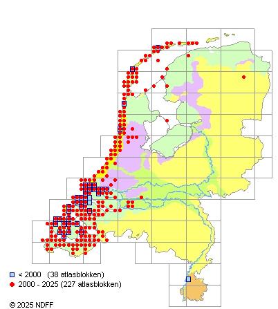 Vrij algemeen. Een echte kustsoort die vrijwel uitsluitend voorkomt in Zeeland en in het zuidwesten van Zuid-Holland; de soort wordt de laatste jaren ook steeds vaker langs de kust van Noord-Holland gezien. RL: niet bedreigd.