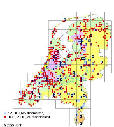 Het aantal atlasblokken (5x5 km) waarin de soort is gemeld binnen een periode van vijf jaar (vanaf 1980) of twintig jaar. Niet gecorrigeerd voor waarnemersinspanning en het aantal doorgegeven waarnemingen kan sterk variëren per periode, dus een trend in verspreiding kan hier niet direct uit worden afgelezen. Het opgegeven jaartal is het eerste jaar van de periode. Bron: gevalideerde waarnemingen uit de NDFF.