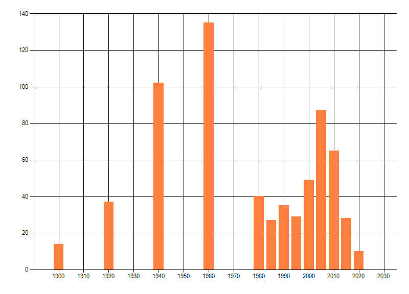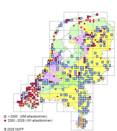 Het aantal atlasblokken (5x5 km) waarin de soort is gemeld binnen een periode van vijf jaar (vanaf 1980) of twintig jaar. Niet gecorrigeerd voor waarnemersinspanning en het aantal doorgegeven waarnemingen kan sterk variëren per periode, dus een trend in verspreiding kan hier niet direct uit worden afgelezen. Het opgegeven jaartal is het eerste jaar van de periode. Bron: gevalideerde waarnemingen uit de NDFF.