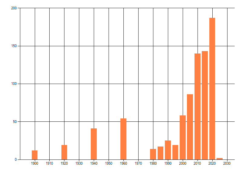 Het aantal atlasblokken (5x5 km) waarin de soort is gemeld binnen een periode van vijf jaar (vanaf 1980) of twintig jaar. Niet gecorrigeerd voor waarnemersinspanning en het aantal doorgegeven waarnemingen kan sterk variëren per periode, dus een trend in verspreiding kan hier niet direct uit worden afgelezen. Het opgegeven jaartal is het eerste jaar van de periode. Bron: gevalideerde waarnemingen uit de NDFF.
