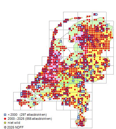 Het aantal atlasblokken (5x5 km) waarin de soort is gemeld binnen een periode van vijf jaar (vanaf 1980) of twintig jaar. Niet gecorrigeerd voor waarnemersinspanning en het aantal doorgegeven waarnemingen kan sterk variëren per periode, dus een trend in verspreiding kan hier niet direct uit worden afgelezen. Het opgegeven jaartal is het eerste jaar van de periode. Bron: gevalideerde waarnemingen uit de NDFF.