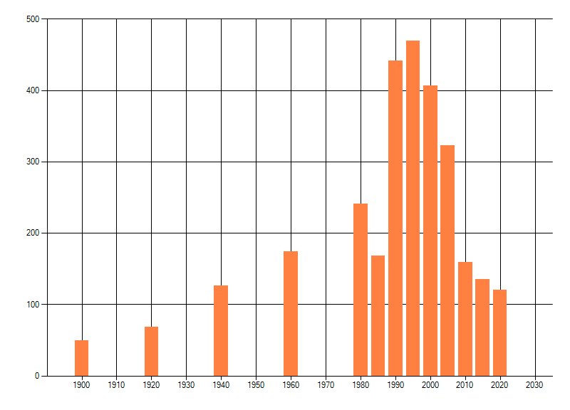 Het aantal atlasblokken (5x5 km) waarin de soort is gemeld binnen een periode van vijf jaar (vanaf 1980) of twintig jaar. Niet gecorrigeerd voor waarnemersinspanning en het aantal doorgegeven waarnemingen kan sterk variëren per periode, dus een trend in verspreiding kan hier niet direct uit worden afgelezen. Het opgegeven jaartal is het eerste jaar van de periode. Bron: gevalideerde waarnemingen uit de NDFF.
