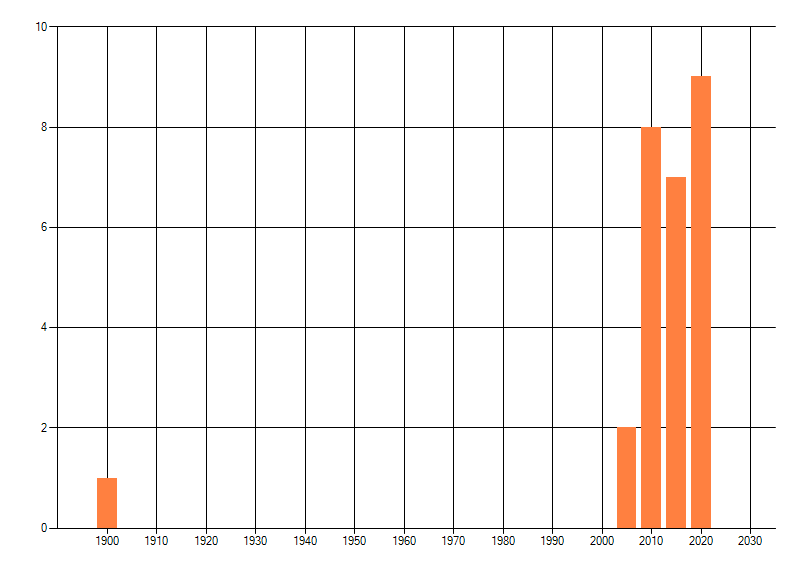 Het aantal atlasblokken (5x5 km) waarin de soort is gemeld binnen een periode van vijf jaar (vanaf 1980) of twintig jaar. Niet gecorrigeerd voor waarnemersinspanning en het aantal doorgegeven waarnemingen kan sterk variëren per periode, dus een trend in verspreiding kan hier niet direct uit worden afgelezen. Het opgegeven jaartal is het eerste jaar van de periode. Bron: gevalideerde waarnemingen uit de NDFF.