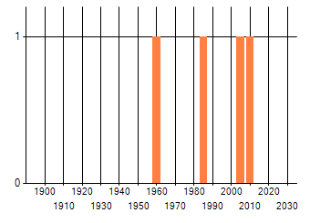 Het aantal atlasblokken (5x5 km) waarin de soort is gemeld binnen een periode van vijf jaar (vanaf 1980) of twintig jaar. Niet gecorrigeerd voor waarnemersinspanning en het aantal doorgegeven waarnemingen kan sterk variëren per periode, dus een trend in verspreiding kan hier niet direct uit worden afgelezen. Het opgegeven jaartal is het eerste jaar van de periode. Bron: gevalideerde waarnemingen uit de NDFF.