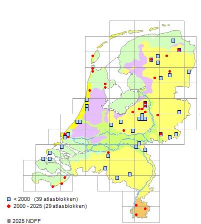 Het aantal atlasblokken (5x5 km) waarin de soort is gemeld binnen een periode van vijf jaar (vanaf 1980) of twintig jaar. Niet gecorrigeerd voor waarnemersinspanning en het aantal doorgegeven waarnemingen kan sterk variëren per periode, dus een trend in verspreiding kan hier niet direct uit worden afgelezen. Het opgegeven jaartal is het eerste jaar van de periode. Bron: gevalideerde waarnemingen uit de NDFF.