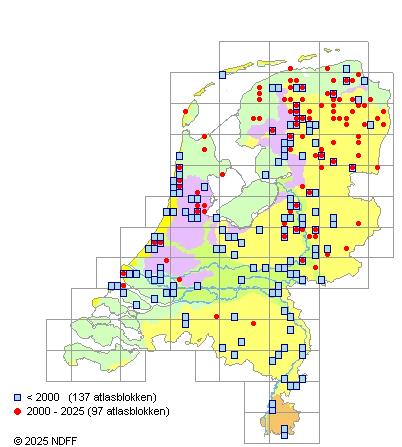 Het aantal atlasblokken (5x5 km) waarin de soort is gemeld binnen een periode van vijf jaar (vanaf 1980) of twintig jaar. Niet gecorrigeerd voor waarnemersinspanning en het aantal doorgegeven waarnemingen kan sterk variëren per periode, dus een trend in verspreiding kan hier niet direct uit worden afgelezen. Het opgegeven jaartal is het eerste jaar van de periode. Bron: gevalideerde waarnemingen uit de NDFF.