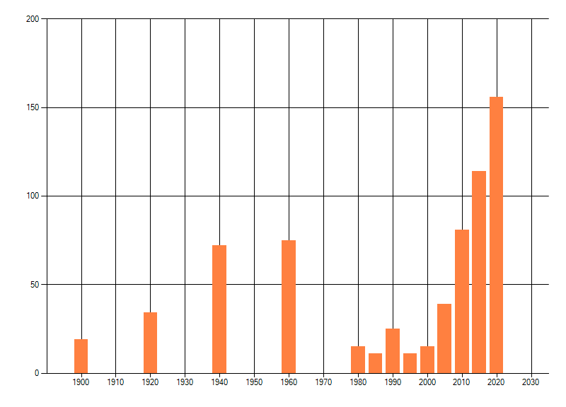 Het aantal atlasblokken (5x5 km) waarin de soort is gemeld binnen een periode van vijf jaar (vanaf 1980) of twintig jaar. Niet gecorrigeerd voor waarnemersinspanning en het aantal doorgegeven waarnemingen kan sterk variëren per periode, dus een trend in verspreiding kan hier niet direct uit worden afgelezen. Het opgegeven jaartal is het eerste jaar van de periode. Bron: gevalideerde waarnemingen uit de NDFF.