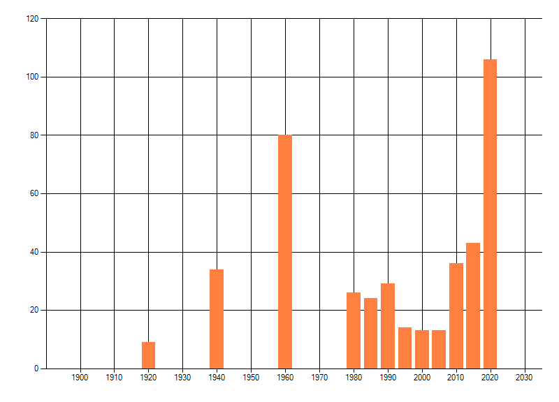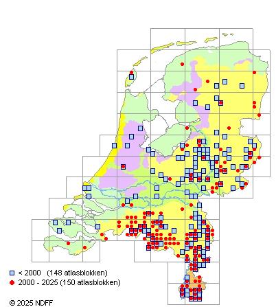 Het aantal atlasblokken (5x5 km) waarin de soort is gemeld binnen een periode van vijf jaar (vanaf 1980) of twintig jaar. Niet gecorrigeerd voor waarnemersinspanning en het aantal doorgegeven waarnemingen kan sterk variëren per periode, dus een trend in verspreiding kan hier niet direct uit worden afgelezen. Het opgegeven jaartal is het eerste jaar van de periode. Bron: gevalideerde waarnemingen uit de NDFF.