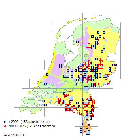 Het aantal atlasblokken (5x5 km) waarin de soort is gemeld binnen een periode van vijf jaar (vanaf 1980) of twintig jaar. Niet gecorrigeerd voor waarnemersinspanning en het aantal doorgegeven waarnemingen kan sterk variëren per periode, dus een trend in verspreiding kan hier niet direct uit worden afgelezen. Het opgegeven jaartal is het eerste jaar van de periode. Bron: gevalideerde waarnemingen uit de NDFF.